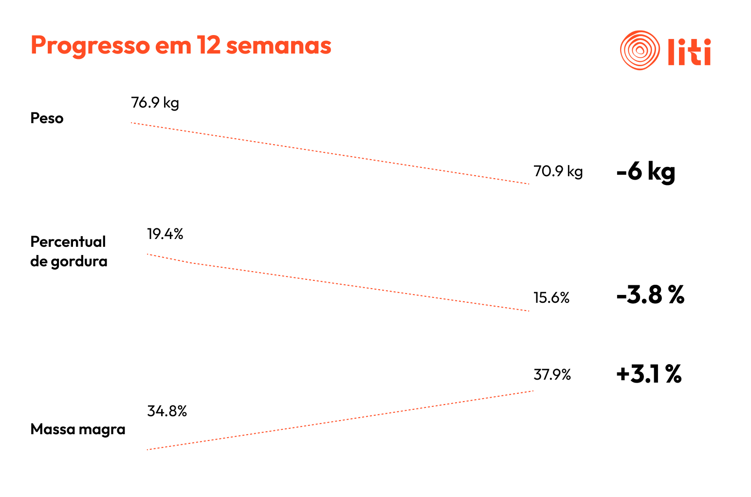 Quando chegou na Liti, estava buscando uma melhora de qualidade de vida como um todo, além de melhorar performance no esporte (corrida). Em primeira consulta, ao analisarmos os dados da balança de bioimpedância, notou-se um excesso de gordura corporal, principalmente na região do abdome — isso indica que há aumento da gordura visceral, aquela que fica nos órgãos e está relacionada ao aumento de doenças crônicas como diabetes, hipertensão arterial e problemas com o colesterol.